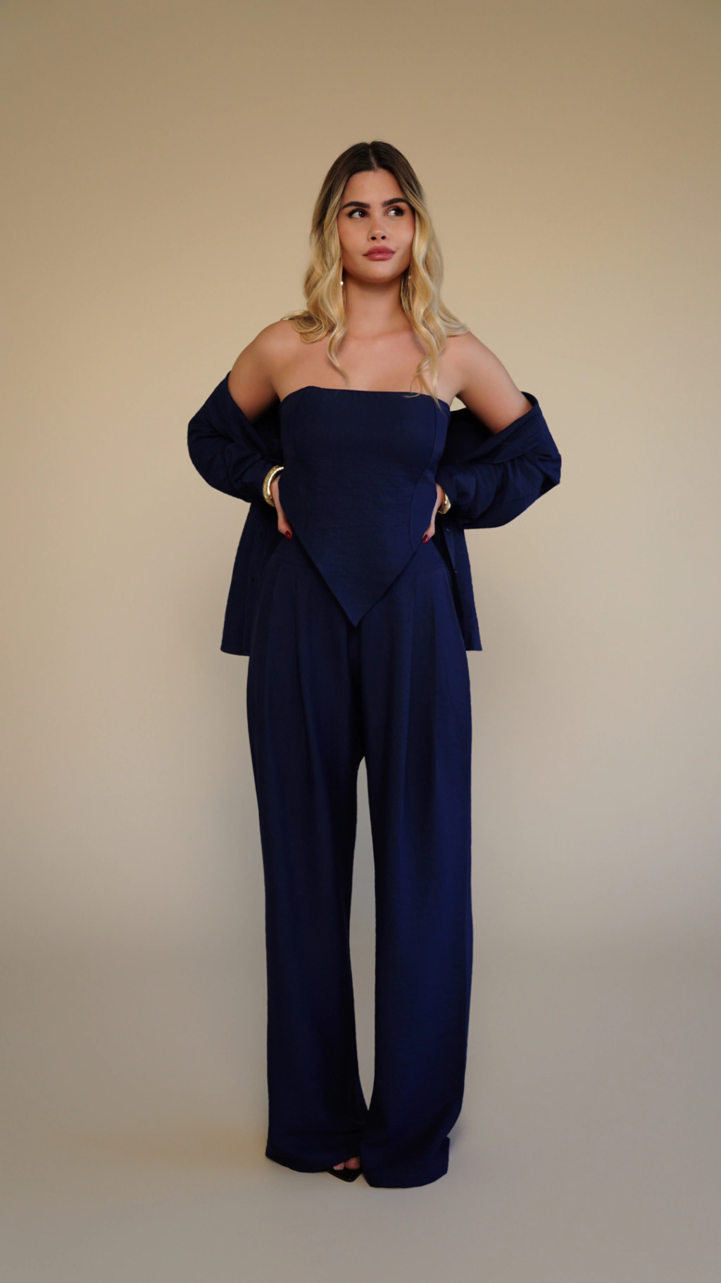 Calça com modelagem mais soltinha wide leg, bolsos faca na frente, cós largo e lástex na parte de trás;