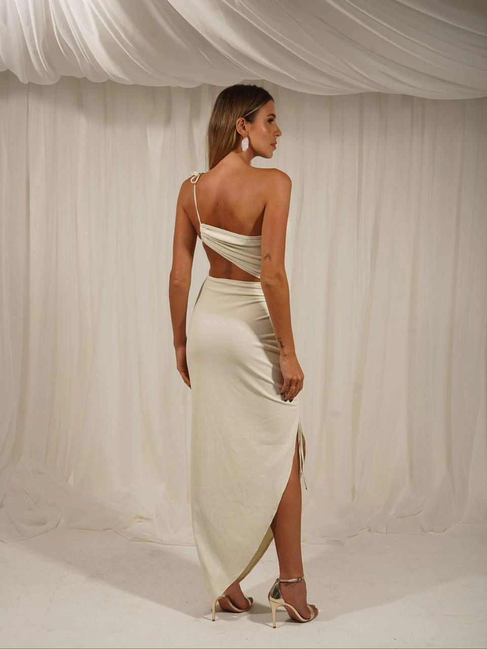 Possui recorte lateral que valoriza a cintur com franzido sutil;